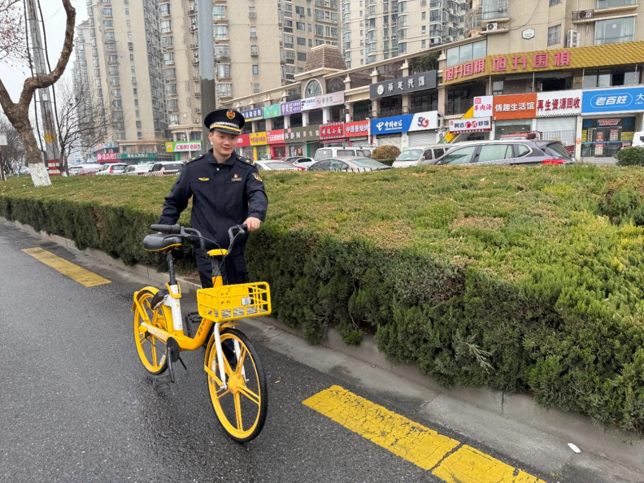 江北新区综合行政执法总队执法人员加强路面市容巡查,及时对违规停放的共享单车进行规范停放。