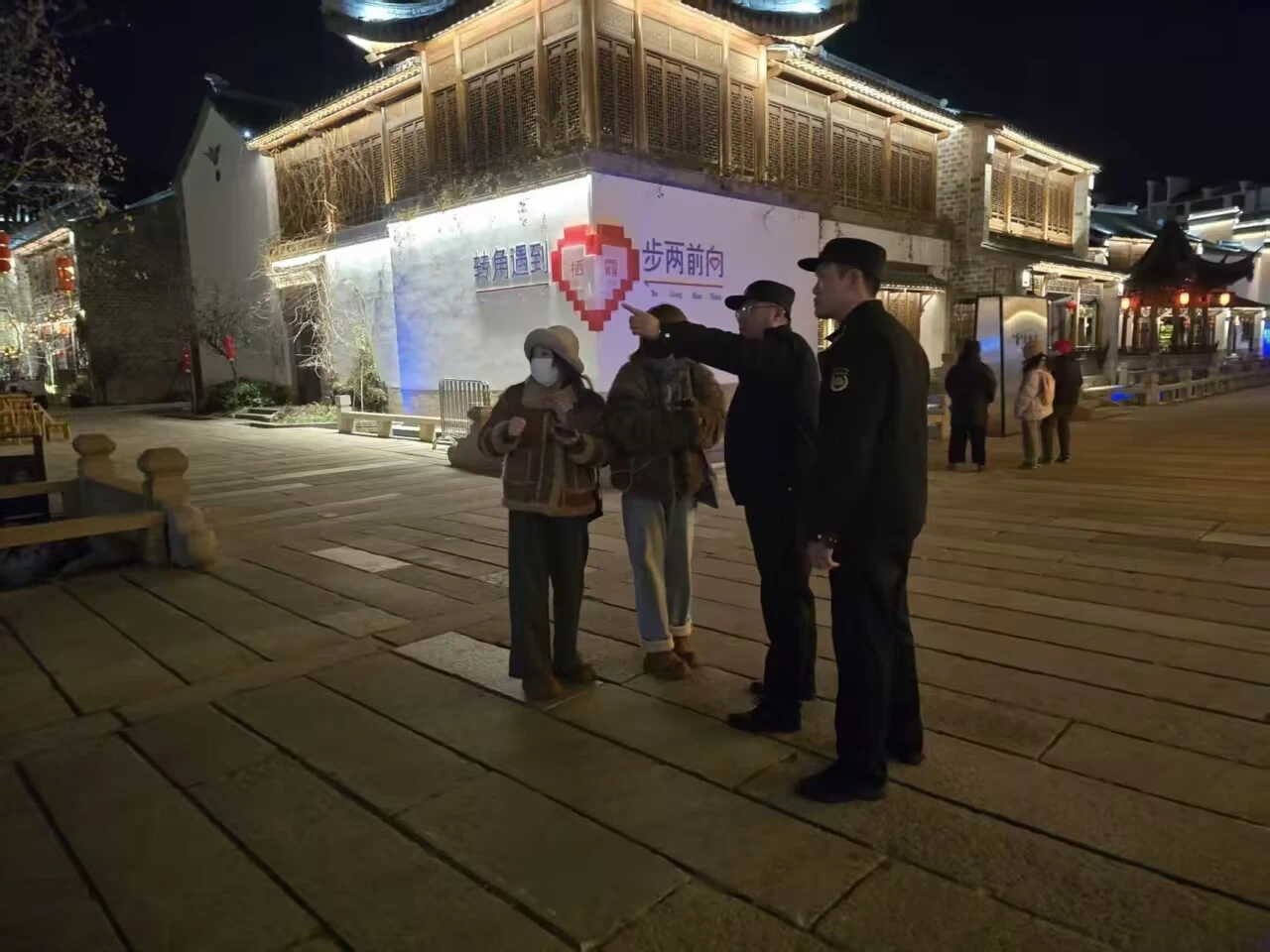 除夕当晚,栖霞区城管执法人员在景区门口维护现场秩序,并为市民提供指引服务。