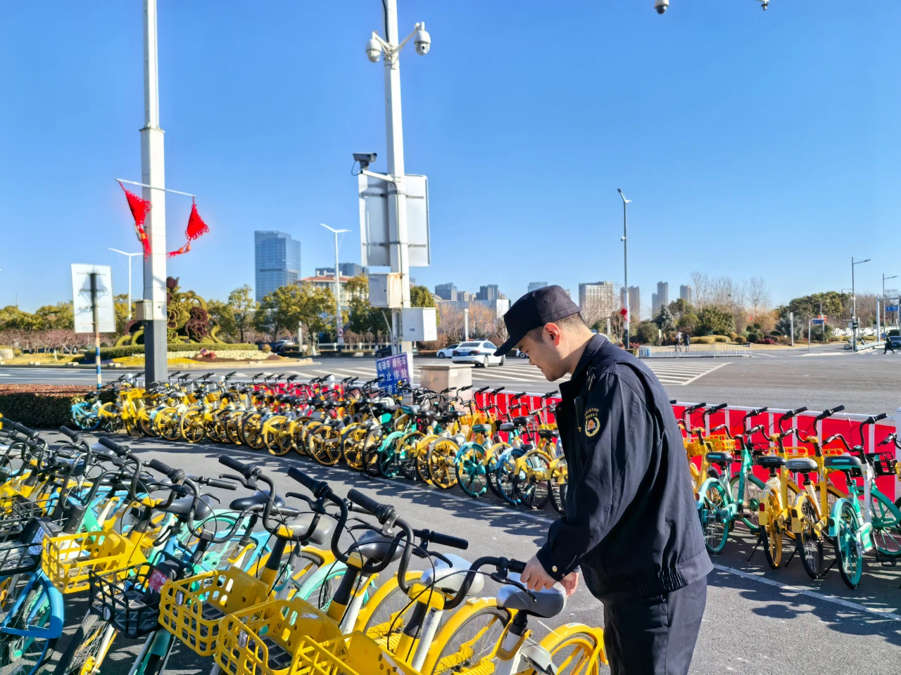 雨花台区城管执法人员在地铁站周边维护单车秩序。